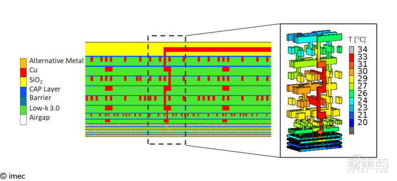 IMEC 通过在局部 2 层金属互连层上进行焦耳热“校准”测量,并通过建模将结果投射到 12 层后端连线(BEOL)结构上,从而量化了这个难题。该研究预测,气隙会使温度升高 20%。研究也发现金属线的密度起着重要作用,较高的金属密度显示有助于减少焦耳热。