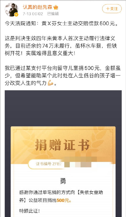昨天,此事再次引发舆论关注。赵勇在微博透露,接到执行局电话,收到黄淑芬转账500元,在其最新一条微博中透露,目前黄淑芬还有约74万欠款未履行,也就是说,几年来,黄淑芬始终未曾支付赔偿款。