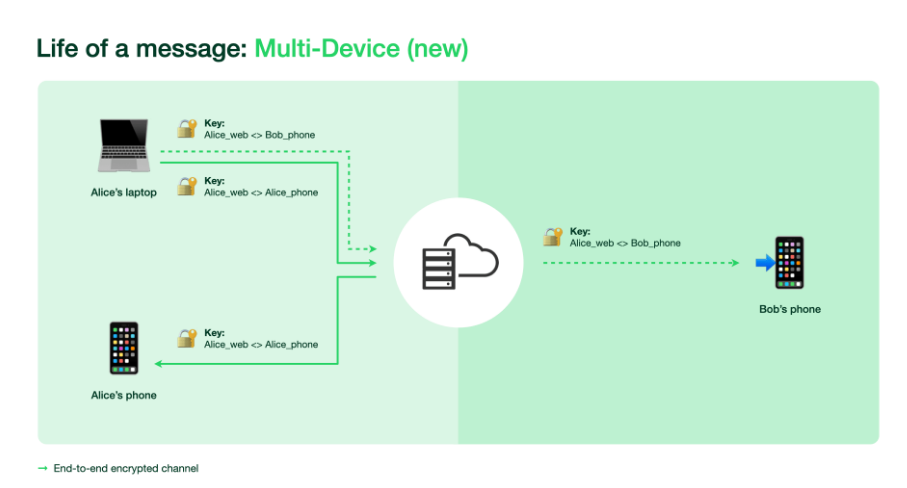 在新的架构下,每个设备都拥有自己的身份密钥,并且扩展了安全代码及自动设备验证,防止受恶意程式入侵的服务器窃取用户的通讯内容。不过在设定及控制哪些设备与帐户相连时,用户则需要继续透过手机扫描 QR code 来连接新设备。