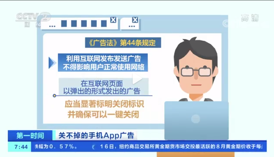 其中《广告法》第 44 条规定,利用互联网发送广告,不得影响用户正常使用网络。在互联网页面以弹出的形式发出的广告,应当显著标明关闭标识,并确保可以一键关闭。