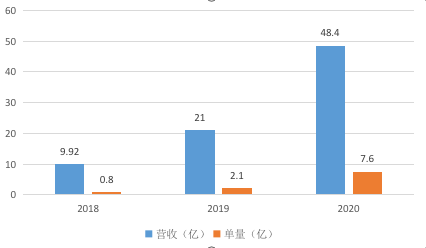 招股书数据显示,2018 年到 2020 年,三年时间,顺丰同城的营收从 9.92 亿元增加至 21 亿元,并在 2021 年继续扩大至 48.4 亿元,年营收增速达到了 126% 和 129%。订单方面亦是如此,近三年分别为 7980 万笔、2.111 亿笔以及 7.609 亿笔。