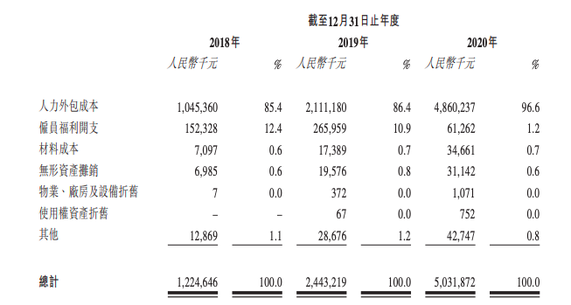 从招股书公开的数据可以看到,人力成本和营销成本是顺丰同城运营成本的大头,也是短时间内难以翻越的大山。数据显示,顺丰同城 2020 年的人力外包成本为 48.6 亿元占营业成本的 96.6%,对比之下,同年其营收才为 48.4 亿元。可以说,顺丰同城这一年完全是在给骑手“打工”。