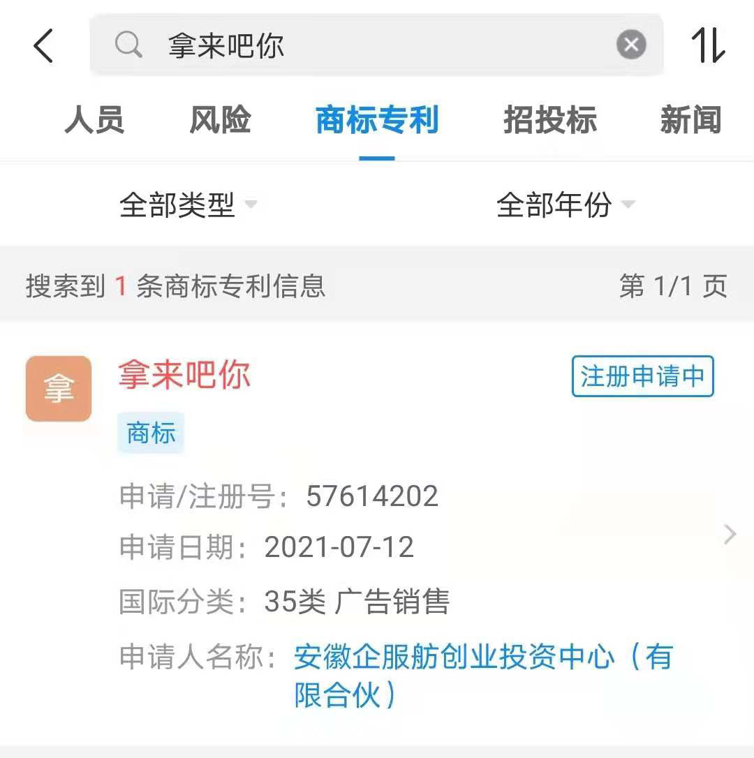 19 日消息 近日,“拿来吧你”被申请注册商标,企查查显示,国际分类涉 35 类广告销售。