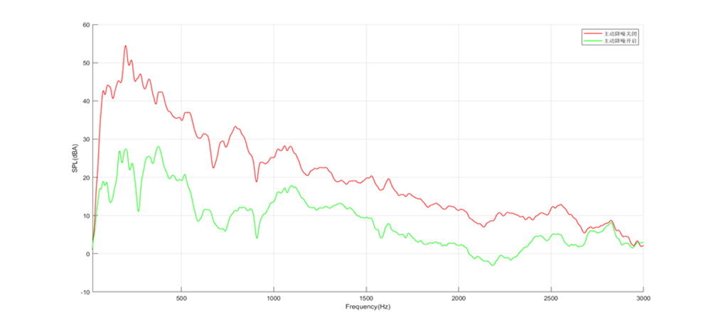 例如,图中的红色曲线是主动降噪关闭后的噪音曲线,绿色曲线是主动降噪开启后的噪声曲线,中间的差额就是降噪深度。