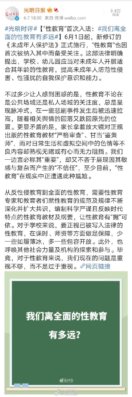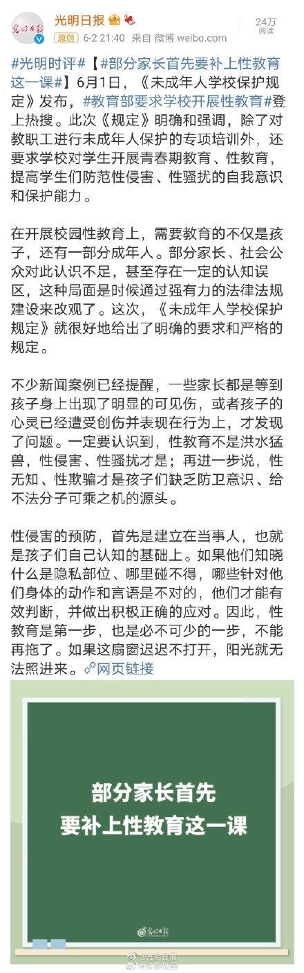 《未成年人学校保护规定》9月1日起实施,这是教育部第一次就未成年人保护制定专门规章。其中明确:将防治学生欺凌、防治校园性侵害纳入专项保护。光明日报评论:性教育不是洪水猛兽,性侵害、性骚扰才是;再进一步说,性无知、性欺骗才是孩子们缺乏防卫意识、给不法分子可乘之机的源头。该如何保护未成年人不受性侵害?