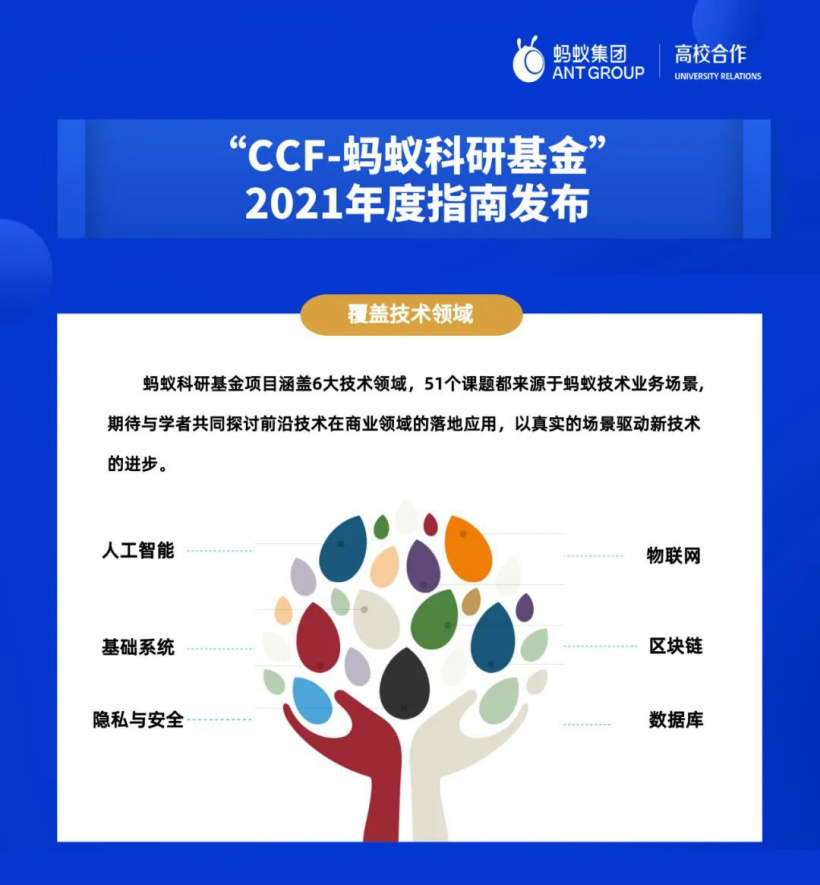2020 年 6 月,中国计算机学会与蚂蚁集团联合发起“CCF-蚂蚁科研基金”,并首次面向全球青年学者发起 29 个前沿技术研究课题申报,共收到来自 66 所高校的 139 份申报材料,最终评选出 22 个项目进行资助。