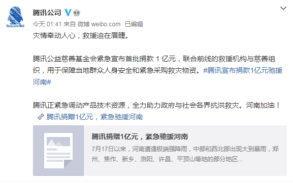 7 月 21 日凌晨,经历一整晚焦急的等待后,腾讯公司微博宣布:腾讯公益慈善基金会将首批捐款 1 亿元,联合受灾区当地的救援机构和慈善组织,用于保障当地群众的人身安全和紧急物资采购。