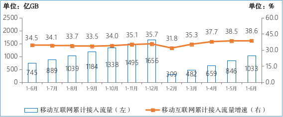 今年上半年,移动互联网累计流量达 1033 亿 GB,同比增长 38.6%,实现连续四个月提速增长。