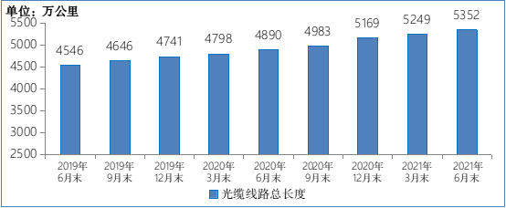 ▲ 2019-2021 年 6 月末光缆线路总长度发展情况