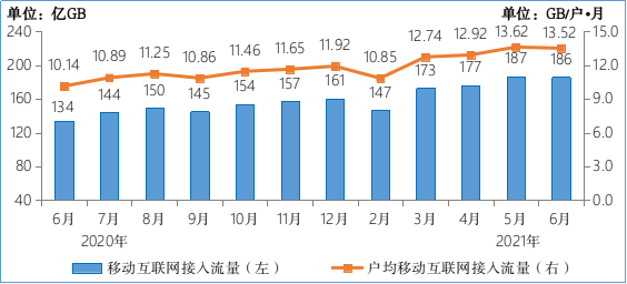 ▲ 2020-2021 年 6 月移动互联网接入月流量及户均流量(DOU)情况