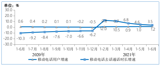 ▲ 2020-2021 年 1-6 月移动电话用户增速和通话时长增速
