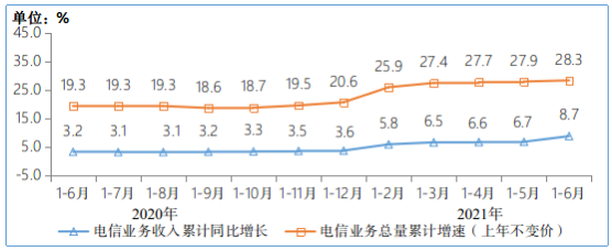 ▲ 图:2020-2021 年 1-6 月电信业务收入和电信业务总量累计增速