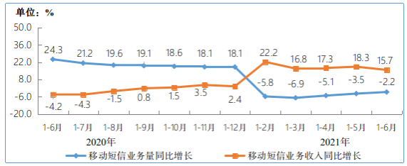 ▲ 2020-2021 年 1-6 月移动短信业务量和收入同比增长情况