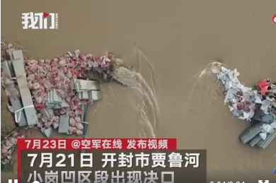 7月23日,空军在线发布一段视频。7月21日,开封市贾鲁河小岗凹区段出现决口,空降兵某旅百余名官兵接到指令后火速前往支援。经过10余小时持续奋战,决口被官兵们成功封堵。