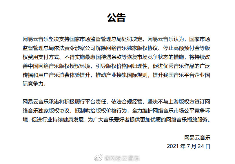 刚刚,网易云音乐发布公告,表示坚决支持国家市场监督管理总局处罚决定,网易云音乐承诺将积极履行平台责任,依法合规经营,坚决不与上游版权方签订网络音乐独家版权协议,抵制哄抬版权价格行为。