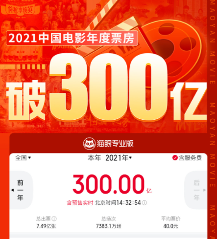 25 日消息 据猫眼专业版数据,截至 7 月 24 日 14 时 32 分,2021 中国电影年度票房(含预售)破 300 亿,总观影人次 7.49 亿,总放映场次 7383.1 万。