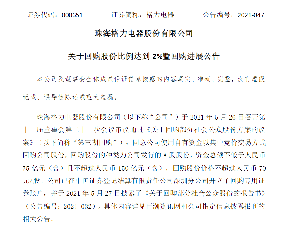 26 日消息 格力电器今日发布公告,称珠海格力电器股份有限公司于 2021 年 5 月 26 日召开第十一届董事会第二十一次会议,审议通过《关于回购部分社会公众股份方案的议案》。该议案同意公司使用自有资金以集中竞价交易方式回购公司股份。