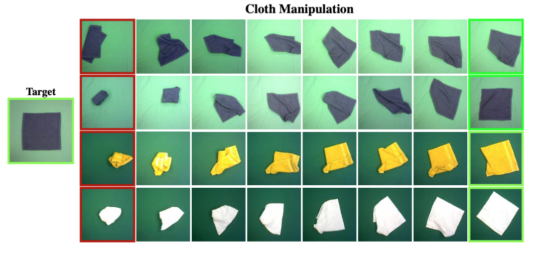 类似的实验也在伯克利 BAIR 实验室中进行,研究人员一直在尝试让智能体挑战完成柔软的织物任务,通过折叠衣物来训练 AI 模仿学习、强化学习、自我监督、视觉预测、深度感应等能力,以不断提高模型的性能。