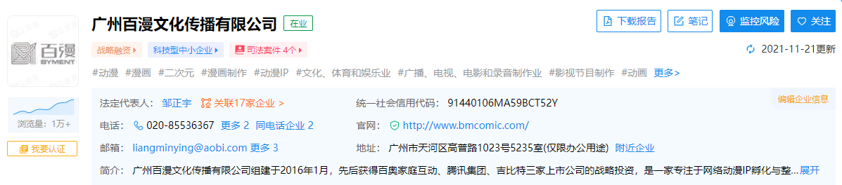 企查查信息显示,百漫文化专注于网络动漫 IP 的孵化与整合运营,公司成立于 2016 年,先后获得百奥家庭互动、腾讯集团、吉比特三家上市公司的战略投资。