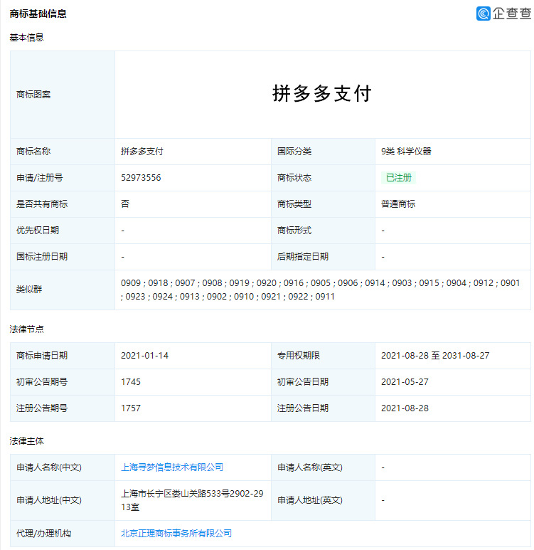 11 月 23 日消息,拼多多关联公司上海寻梦信息技术有限公司现已成功注册拼多多支付商标。