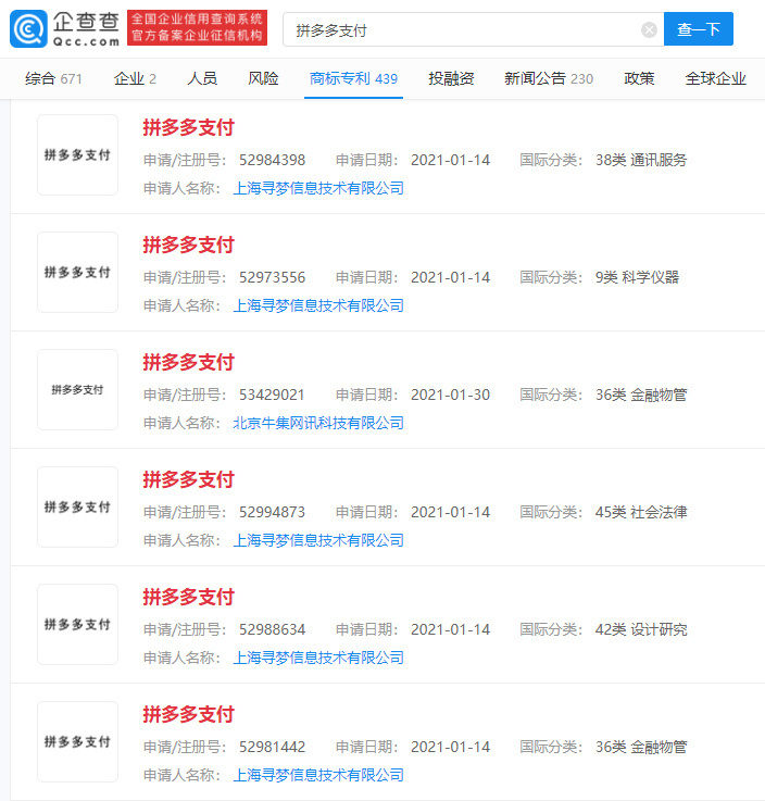 企查查 App 显示,“拼多多支付”商标国际分类涉办公用品、科学仪器等,最早申请日期为 2021 年 1 月 14 日。