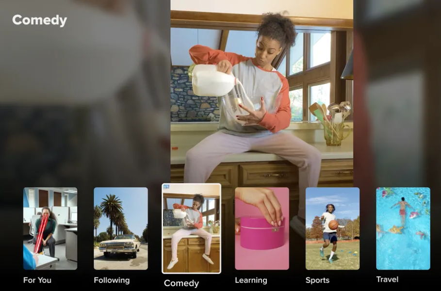 TikTok TV 应用专为电视家庭观看体验而打造,让用户可以轻松地在大屏幕上观看“为你(推荐)”和“关注”中的内容。从游戏、喜剧到食物、动物等各种类别,用户可以看到最受欢迎和观看次数最多的视频。