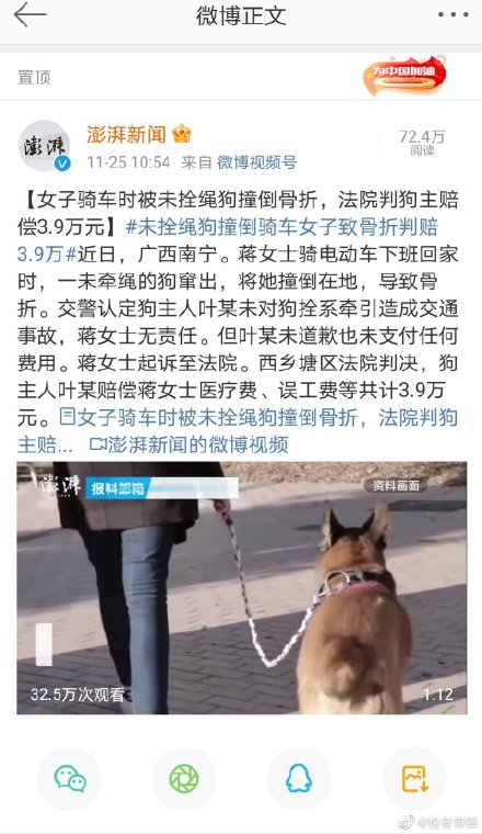 广西南宁 未拴绳狗撞倒骑车女子致骨折判赔3.9万