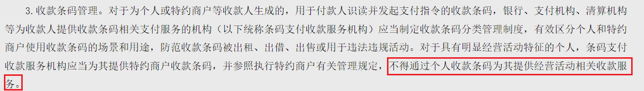 收款条码管理方面,通知明确要求,对于为个人或特约商户等收款人生成的,用于付款人识读并发起支付指令的收款条码,银行、支付机构、清算机构等为收款人提供收款条码相关支付服务的机构(以下统称条码支付收款服务机构)应当制定收款条码分类管理制度,有效区分个人和特约商户使用收款条码的场景和用途,防范收款条码被出租、出借、出售或用于违法违规活动。对于具有明显经营活动特征的个人,条码支付收款服务机构应当为其提供特约商户收款条码,并参照执行特约商户有关管理规定,不得通过个人收款条码为其提供经营活动相关收款服务。