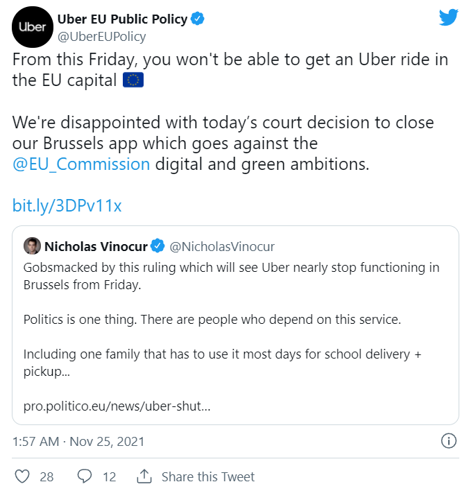 28 日消息,Uber 优步宣布将不再向比利时首都布鲁塞尔提供乘车服务。该公司的公告于周三发布,同一天,布鲁塞尔上诉法院裁定,禁止私人提供出租车服务的禁令也适用于 Uber 优步平台的司机。