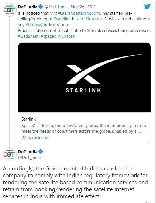 印度电信部 (DOT) 在周五发表的声明中称,SpaceX 已被要求需要遵守印度提供卫星通信服务的监管框架,不得“在印度预订或提供卫星互联网服务”。换句话说,SpaceX 将不得不暂停星链服务预订,直到获得印度政府的批准。