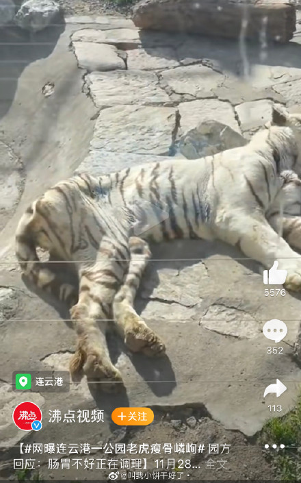 11月28日,江苏连云港,游客爆料称新浦公园内老虎骨瘦嶙峋,肚子凹陷严重,奄奄一息地躺在地上。29日,园方工作人员称,那只老虎最近肠胃不好,正在调理恢复中。