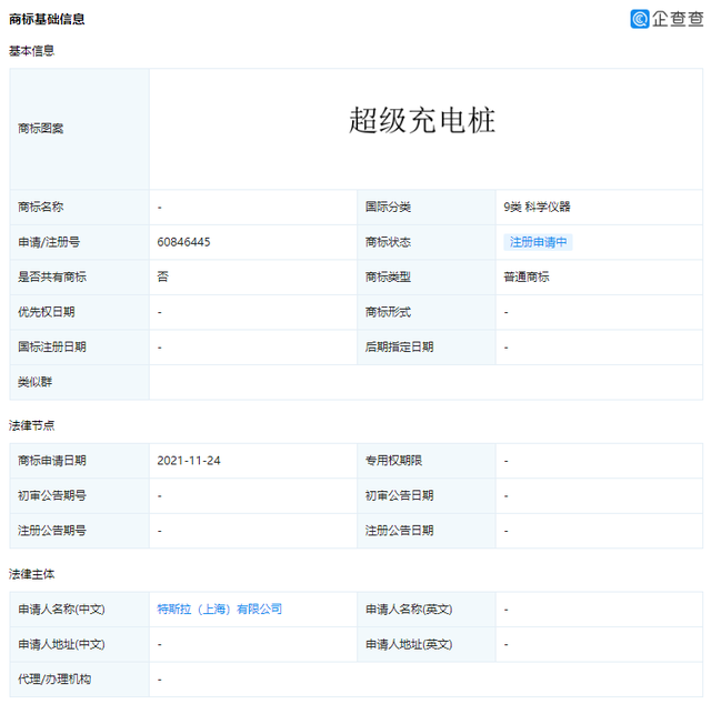 30 日消息,特斯拉(上海)有限公司近日申请“特斯拉超级充电桩”“超级充电站”“超充”等商标。
