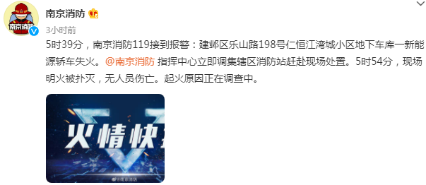 南京消防微博相关信息显示,今日 5 时 39 分,南京消防 119 接到报警,建邺区乐山路 198 号仁恒江湾城小区地下车库一新能源轿车失火。南京消防指挥中心立即调集辖区消防站赶赴现场处置。5 时 54 分,现场明火被扑灭,无人员伤亡。起火原因正在调查中。