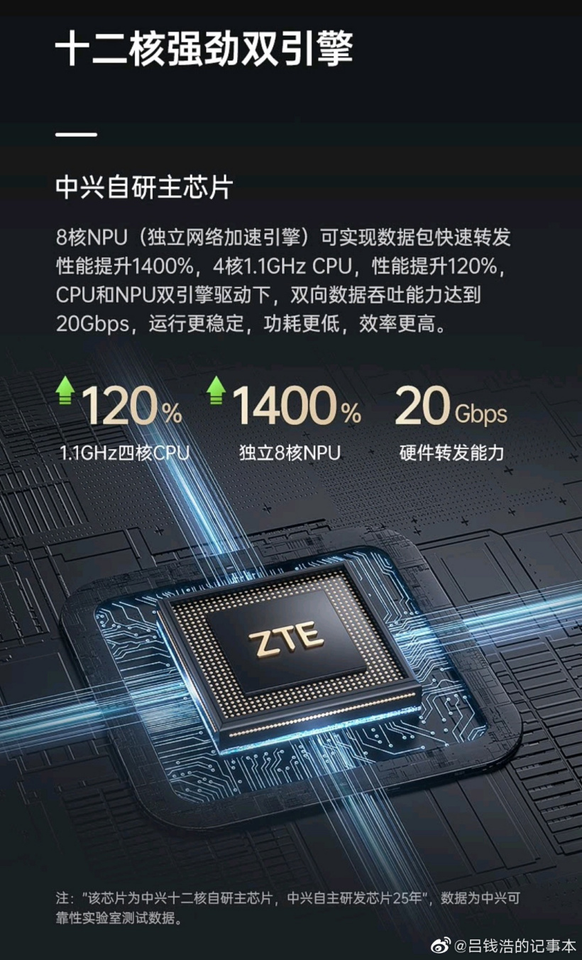 中兴 AX5400 Pro 就是搭载了这颗芯片,8 核 NPU(独立网络加速引擎)可实现数据包快速转发性能提升 1400%,4 核 1.1GHz CPU 性能提升 120%,CPU 和 NPU 双引擎驱动下,双向数据吞吐能力达到 20Gbps。