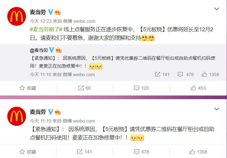 麦当劳官方微博称,因系统原因,【5 元板烧】请凭优惠券二维码在餐厅柜台或自助点餐机扫码使用!麦麦正在加急修复中!!今天中午 12 点 23 分回应,线上点餐服务正在逐步恢复中,【5 元板烧】优惠将延长至 12 月 2 日。请麦粒们不要着急,谢谢大家的理解和支持。