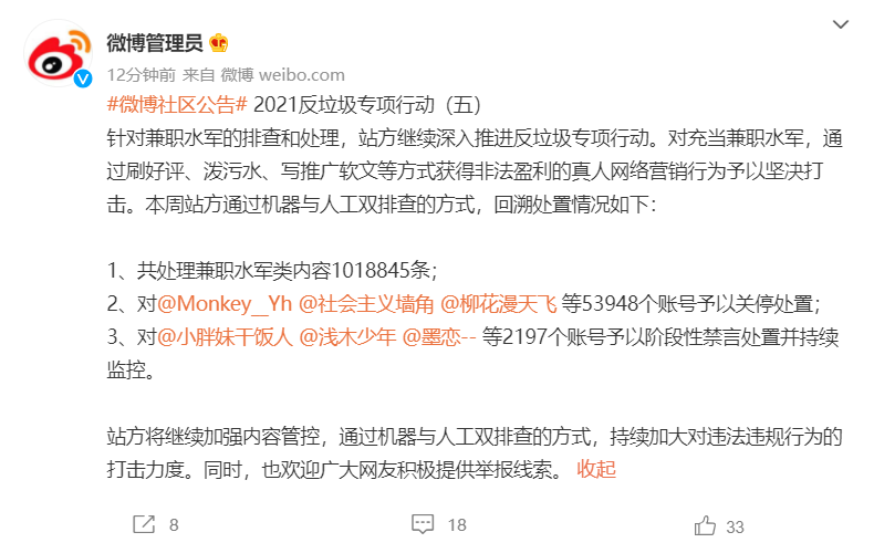 微博推进反垃圾行动:处理兼职水军类内容 1018845 条
