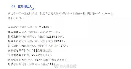 一张关于“复旦学霸”的截图引发热议。其中,2017级临床医学专业(五年制)的孔怡德过去一年去复旦图书馆医科馆打卡1424次。