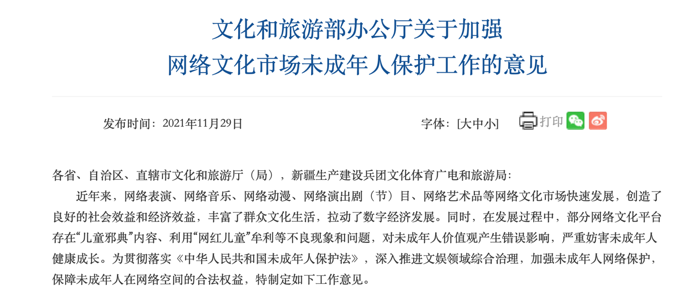 12 月 1 日消息,今天,文化和旅游部印发关于加强网络文化市场未成年人保护工作的意见。意见指出,严禁借“网红儿童”牟利。