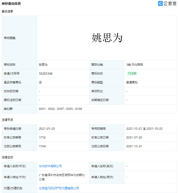 3 日消息,近期,华为技术有限公司成功注册姚思为、YAO SIWEI、ANNABEL YAO 商标,商标国际分类涉服装鞋帽、方便食品等。企查查 App 显示,华为目前也已经完成了姚安娜商标的注册。