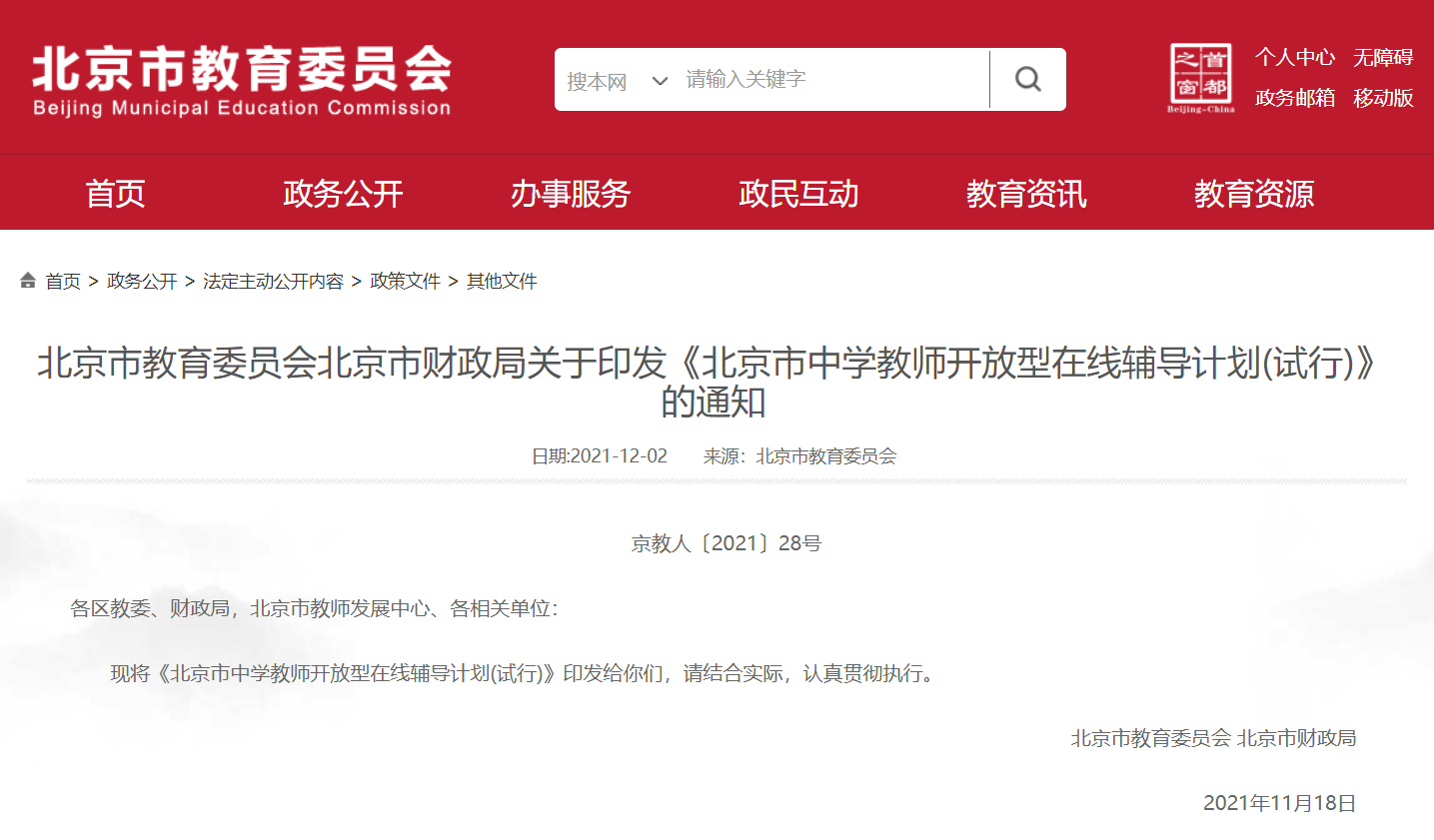 北京建设教师在线辅导云平台,2022 年覆盖所有初中学生!