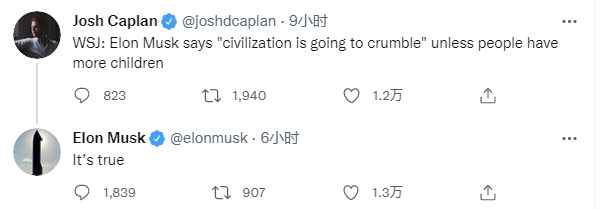 马斯克在周一的一次视频采访中表示,人口低增长是人类文明面临的最大风险之一。他认为人口崩溃可能是“未来人类文明面临的最大风险”,人类需要更多地繁衍后代才能将生命带到火星。