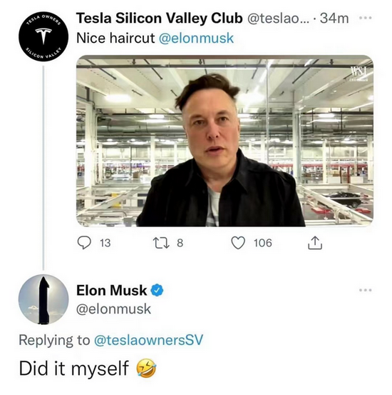 特斯拉夸老板新发型真不错, 马斯克:我自己弄的!