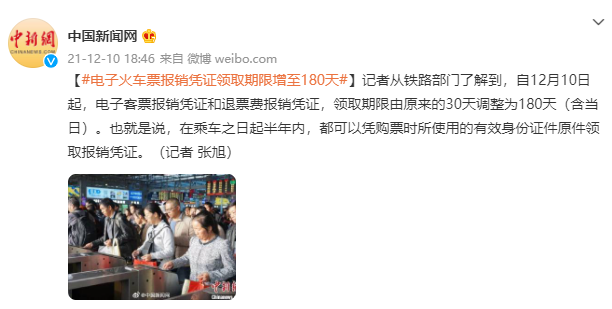 10 日消息,据中国新闻网报道,从铁路部门获悉,自 12 月 10 日起,电子客票报销凭证和退票费报销凭证,领取期限由原来的 30 天调整为 180 天(含当日)。
