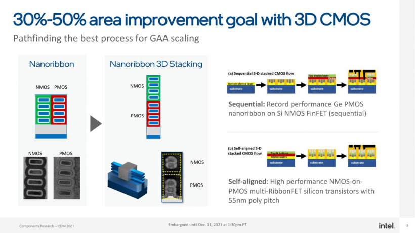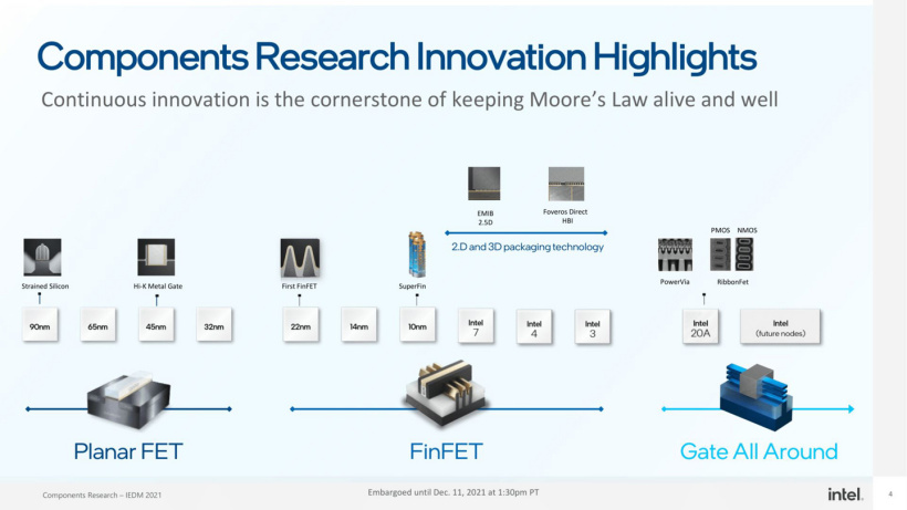 英特尔于 2021 年 7 月展现了 RibbonFET 新型晶体管架构,作为 FinFET 的替代。全新的封装方式可以将 NMOS 和 PMOS 堆叠在一起,紧密互联,从而在空间上提高芯片的晶体管密度。这种方式能在制程不便的情况下,将晶体管密度提升 30% 至 50%,延续摩尔定律。
