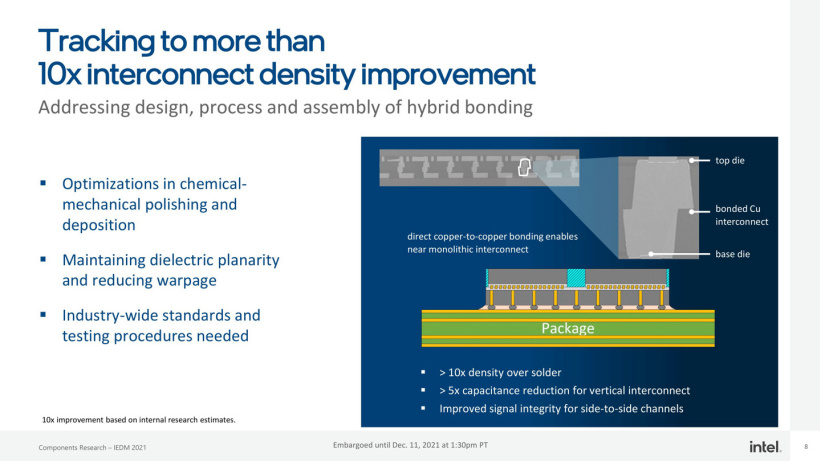 这项技术应用于多种芯片混合封装的场景,可以将不同功能、不同制程的芯片以相邻或者层叠的方式结合在一起。Foveros Direct 技术使得上下芯片之间的连接点密度提升了 10 倍,每个连接点的间距小于 10 微米。