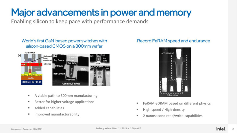 上图右侧展现的是英特尔研发的低延迟内存技术:FeRAM。这种芯片将铁元素引入芯片的制造,可以大大提高内存芯片的读写速度,在 2 纳秒内完成读写。同时,FeRAM 技术能够提高内存芯片的密度。