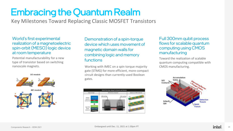 英特尔和 IMEC 正在自旋电子材料研究方面取得进展,预计未来可以制造出能够量产的全功能器件。此外,英特尔还展示了与目前 CMOS 芯片兼容的 300mm 晶圆量子运算电路的制造,并确立了未来的研究方向。