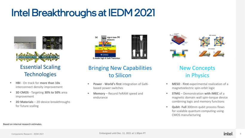 在在 2021 年 IEEE 国际电子设备会议上,英特尔公布了多芯片混合封装互联密度提高 10 倍、晶体管密度提升 30%-50%、新的电源和存储器技术以及量子计算芯片技术等等。