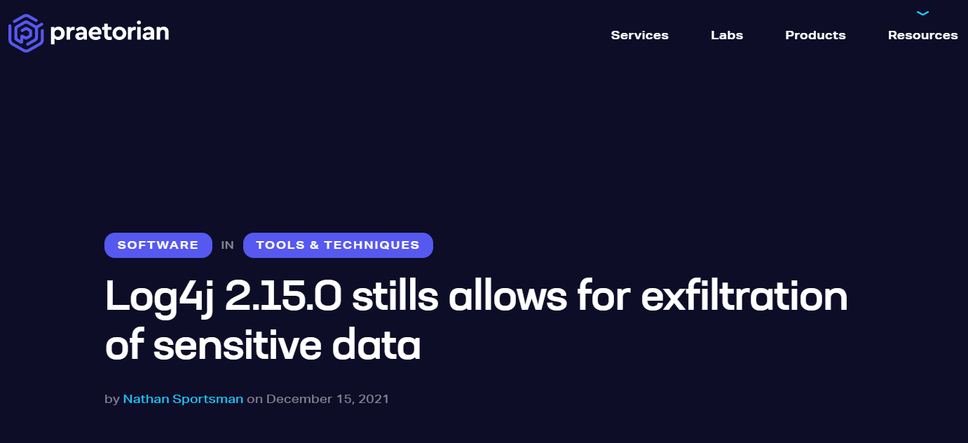 然而,安全公司 Praetorian 在博客宣布,他们在 Apache Log4j 2.15.0 版本又发现了一个敏感数据泄露的漏洞,可用于从受影响的服务器下载数据。