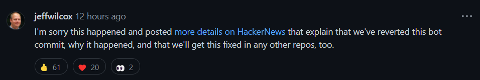 Jeff Wilcox 表示,该机器人脚本旨在防止过去在发布项目时遇到的其他问题,但它错误地在 fork 时运行。他将审核所有的 fork 存储库,并将类似的更改恢复到其他项目。